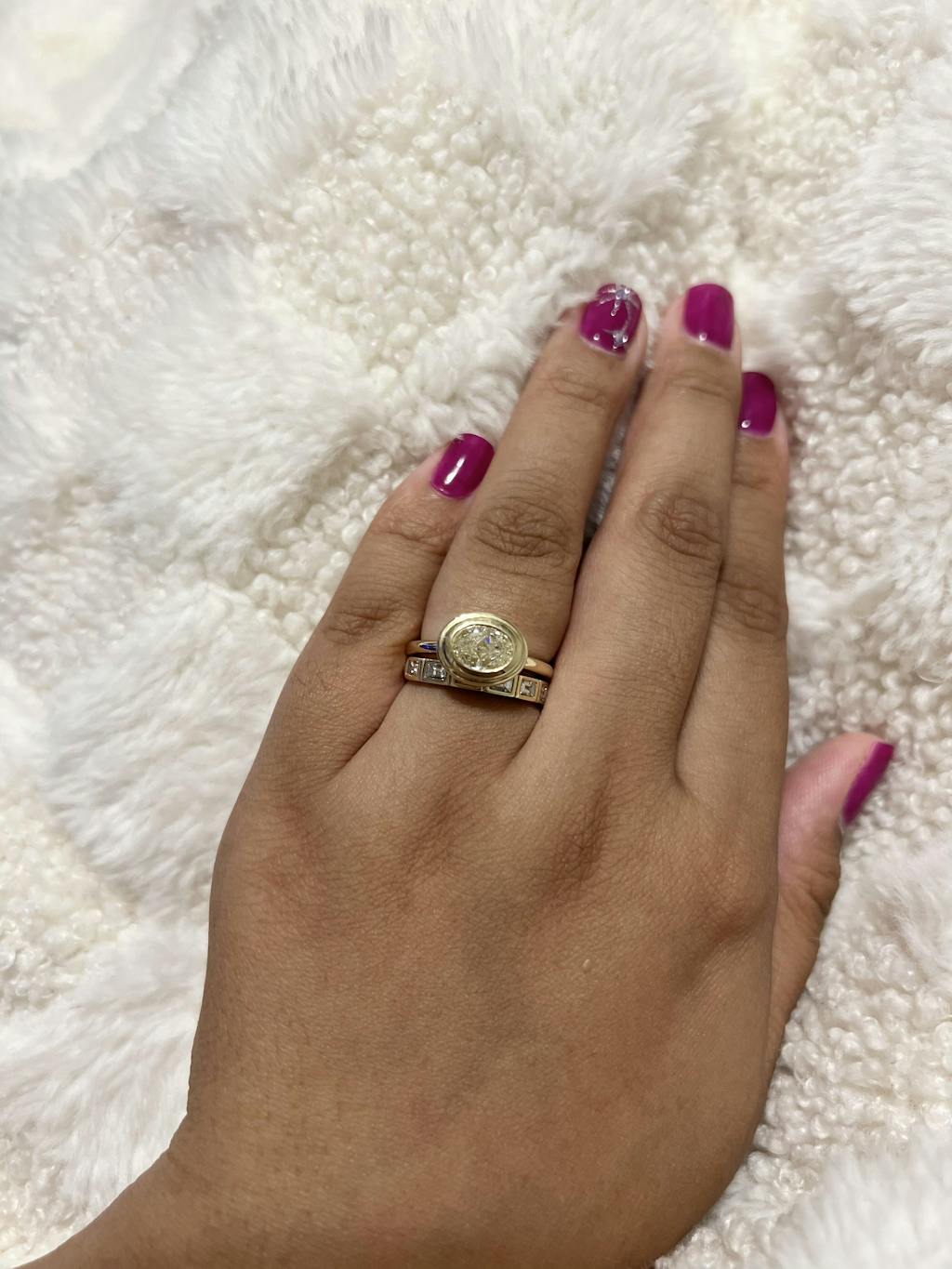 Proving modern and unique can coexist. A 1.28ct oval modified cut Yellowish Diamond, SI2, is set into a double metal bezel for optical illusion. Set east to west to play up the unique proportions. Tapered head with side etching to allow for easier cleaning. The "new" classic!