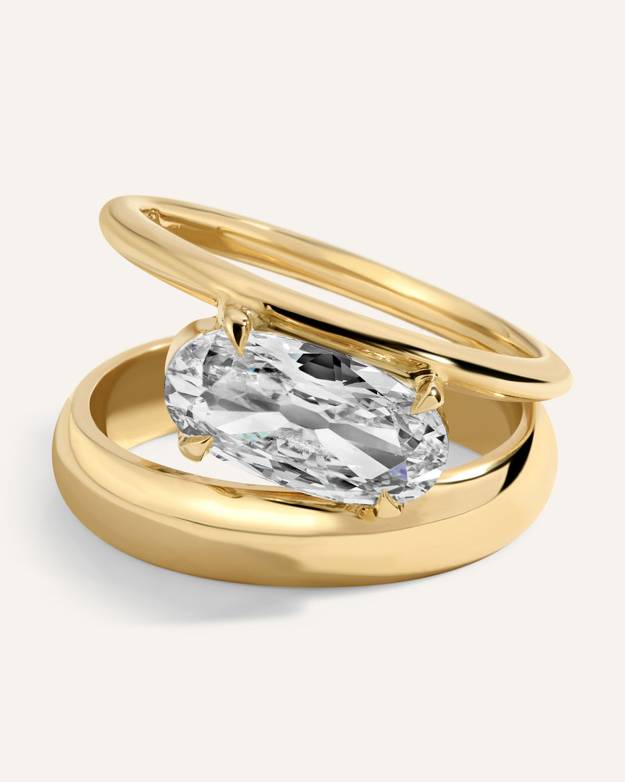 Awe-inducing and totally one of a kind. A 1.5ct, VVS1, N color Oval Brilliant Diamond is striking on its own, however the unique setting only adds to the piece's beauty. Two bands form an asymmetrical design that seems to defy gravity. GIA certified and one of a kind.